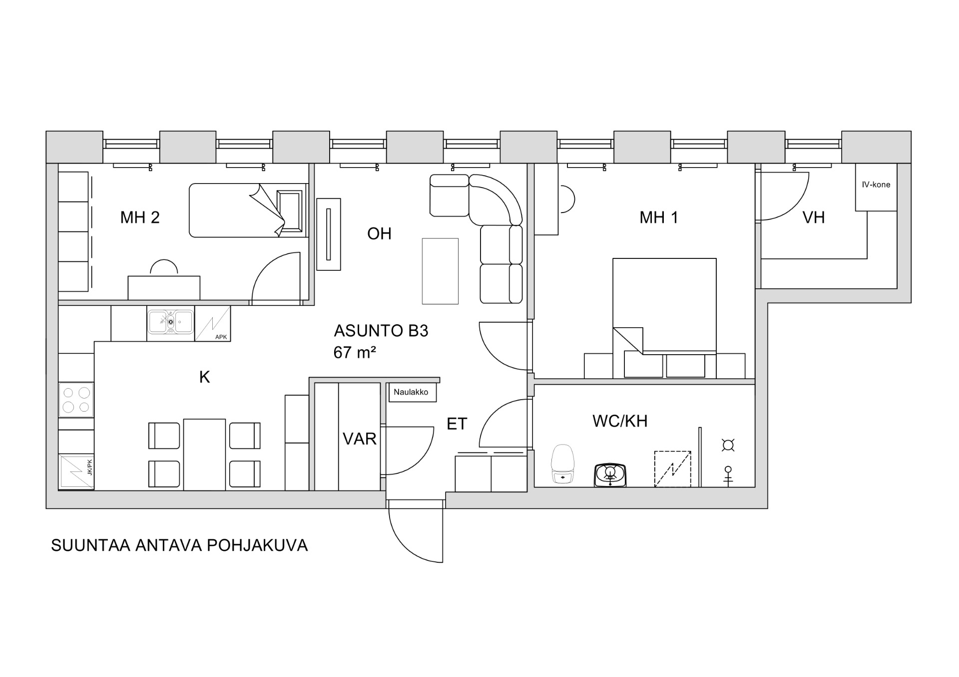 3h+kt, 67 m², 2-krs, pihanäkymä